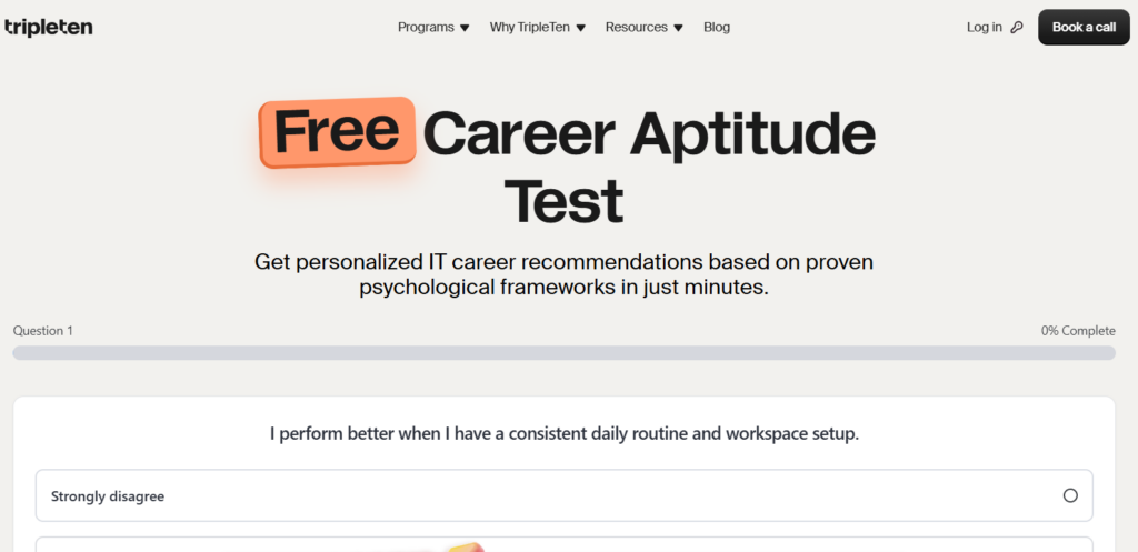 An example of such a tool is TripleTen’s Free Career Aptitude Test, a career quiz that provides personalized IT career recommendations based on proven psychological frameworks in just minutes.